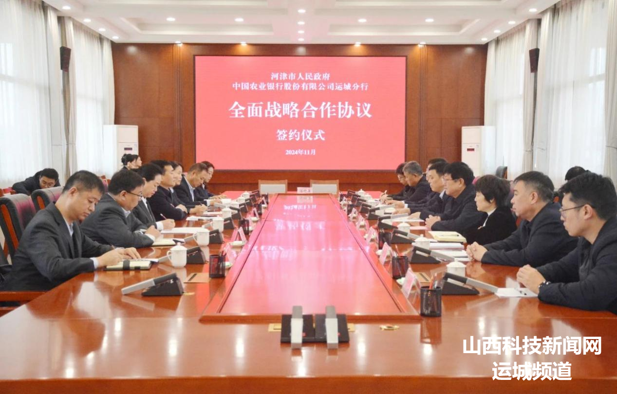 在王云和都郭胜的见证下,闫新善与席军芳分别代表河津市人民政府和中国农业银行运城分行签署了全面战略合作及支持乡村振兴发展合作协议。(韩国栋 许建国)