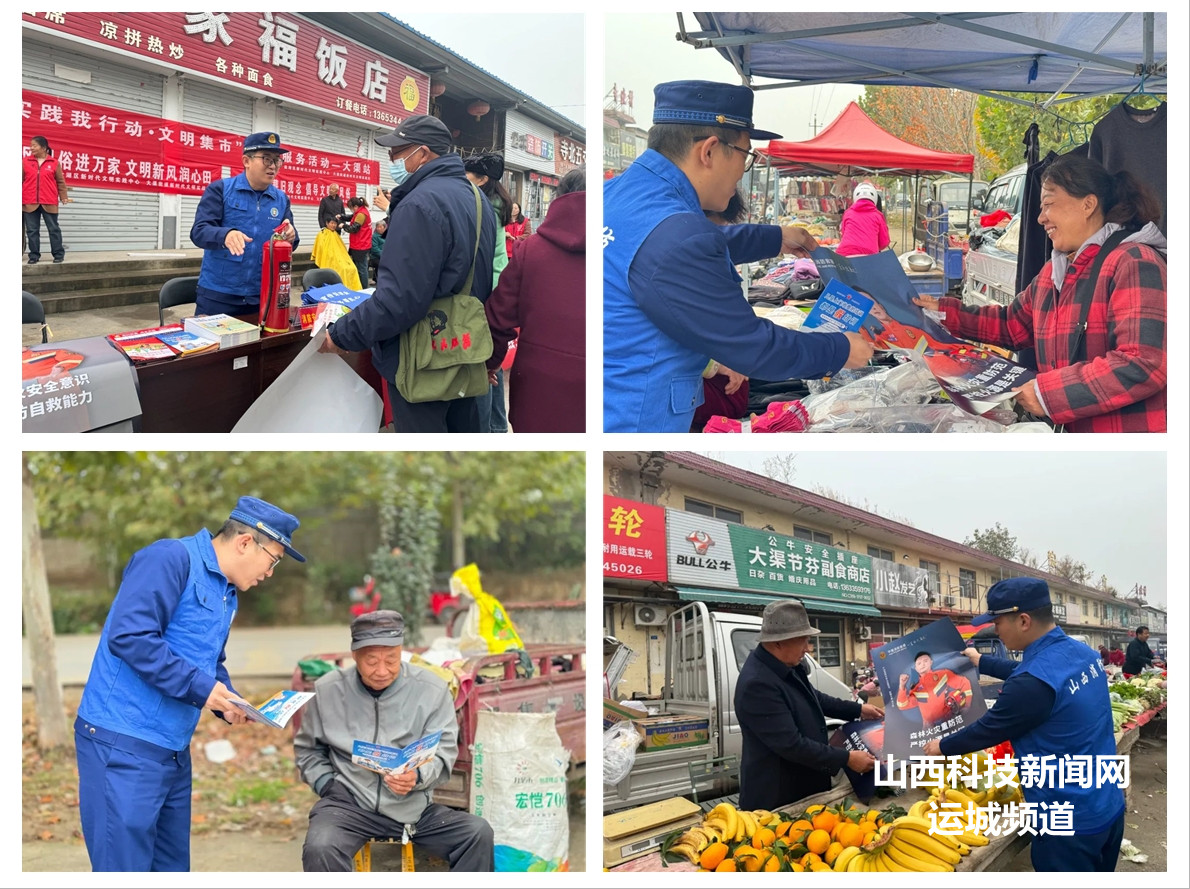 盐湖区消防救援大队宣传人员走进辖区农村集市借助“赶集”的机会,从农贸集市、市场人流密集、流动性大的消防安全实际出发,利用通俗易懂的语言为村民和商户详细讲解安全用火、用电、用气的注意事项、如何预防火灾、发生火灾后如何自救逃生、如何扑救初起火灾等消防安全常识。