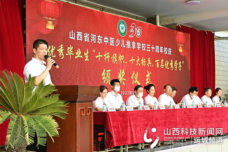 山西科技新闻网运城讯(刘武国 张琳洁)为深入宣传优秀典型,发挥榜样引领作用,6月18日,山西省河东中医少儿推拿学校举行优秀毕业生“十杆旗、十大标兵、百名优秀学子及拟提名优秀学子”荣誉获得者颁奖仪式。校长孙德仁,校领导程温明、王建红、李晓斌等出席活动,学校老师、获奖学生代表以及现场观礼学生齐聚一堂,共同见证了典礼荣光。