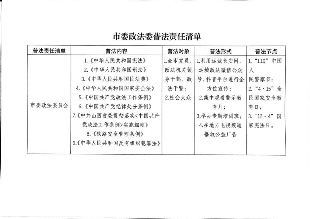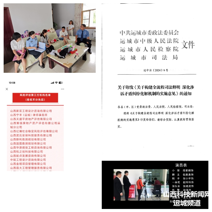 (二)聚焦主责主业,打造普法矩阵。一是积极发挥政法委牵头抓总、统筹协调、督办落实作用,指导政法机关、综治网格依托法律服务站点、综治中心等阵地,深化“三官一律”、法律“明白人”、“人民调解员”、“智慧平台”等工作载体,加大法律宣传力度,真正解决群众婚姻、邻里、债务等实际纠纷,有力提升群众工作的主动性和针对性。二是依托市县乡三级网格中心阵地优势,落实“送法入户”“普法剧”等群众喜闻乐见的方式,加大对国家安全法、反有组织犯罪法、民法典等与群众生产生活息息相关的法律宣传力度,不断提升群众遇事找法、解决问题靠法的意识。三是紧盯矛盾纠纷化解,坚持发展新时代“枫桥经验”,按照“预防走在排查前、排查走在化解前、化解走在激化前,稳控走在上访前”的“四前”原则,引导群众理性表达利益诉求,及时就地化解纠纷,让身边人影响身边人、身边人带动身边人,使“知法、守法、用法”逐渐走进百姓心中。四是充分发挥法律顾问作用,“八五”普法规划实施以来,组建成立了重大决策社会稳定风险评估第三方机构库和专家库,扎实开展重大决策社会稳定风险评估工作,对事关人民群众切身利益且涉及面广、容易引发社会稳定问题的重大决策、重大工程项目以及其他重大决策事项,在出台或审批前,认真组织社会稳定风险评估,依据评估结论作出决策,从源头上防范化解矛盾隐患。今年,中央政法委第一期简报表扬了运城市工作做法和经验。五是构建全流程司法释明,深化涉诉矛盾纠纷化解机制。2024年10月14日,市委政法委联合市中级人民法院、市检察院、市司法局共同出台了《关于构建全流程司法释明,深化涉诉矛盾纠纷化解机制的实施意见》,深化我市平安建设,以公开促公正,满足人民群众多元司法需求,引导当事人服判息诉和履行裁判义务,持续提升司法公信力。
