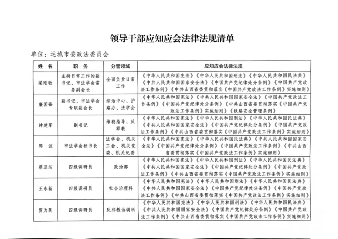 (一)立足政法工作,强化法律学习。一是立足对政法单位的监督指导职责,组织机关干部针对性的学习了《中华人民共和国民事诉讼法》《中华人民共和国刑事诉讼法》《中华人民共和国行政诉讼法》《中国共产党政法工作条例》以及最高人民法院关于办理减刑、假释案件审查财产性判项执行问题的规定等法律法规和司法解释。二是立足维护社会稳定的职责,组织相关科室学习了《中华人民共和国宪法》《中华人民共和国国家安全法》《中华人民共和国反有组织犯罪法》以及最高人民法院关于商品房消费者权利保护问题的批复、最高人民法院关于正确确定强制拆除行政诉讼案件被告及起诉期限的批复等法律法规和司法解释。三是立足化解矛盾纠纷的职责,组织机关干部、乡镇政法委员、网格员等学习了《中华人民共和国民法典》《中华人民共和国刑法》以及最高人民法院关于审理涉彩礼纠纷案件适用法律若干问题的规定等法律法规和司法解释。四是立足常态化开展扫黑除恶工作,组织机关干部和政法干警学习了《中华人民共和国刑法》《中华人民共和国反有组织犯罪法》以及最高人民法院关于审理黑社会性质组织犯罪的案件具体应用法律若干问题的解释等法律法规和司法解释。通过普遍性和针对性的法律法规学习,营造了浓厚的学习宣传氛围,机关干部对法律知识的理解和应用能力明显提升。
