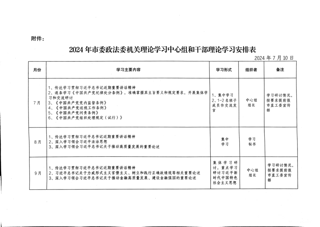 (一)强化中心组带头学,发挥示范引领作用。根据普法责任清单和全市政法工作实际,制定了《2024年市委政法委机关理论学习中心组和干部理论学习重点内容安排》,列出了中心组学习清单,明确了学习内容,采取集体学习和个人自学的方式,进行普法教育。委领导班子理论学习中心组先后共开展11次法治专题学习,引领全体党员干部积极主动开展学习教育,推动机关形成浓厚学习氛围。