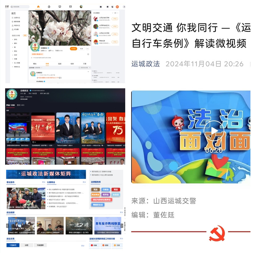 (三)丰富宣传载体,形成宣传合力。一是充分利用新媒体资源,通过“运城政法”微博、抖音、今日头条、微信公众号等线上方式,扎实开展法律法规网络宣传,2024年发布普法宣传文章350篇、普法宣传视频98条。二是在重要时间节点,组织力量前往广场、路口、社区等人流量密集地点,以制作横幅、发放宣传手册、现场解答等形式,向社会群众大力宣传《中华人民共和国宪法》《中华人民共和国国家安全法》《中华人民共和国反有组织犯罪法》《中华人民共和国民法典》,促使尊法、学法、守法、用法成为广大干部群众行动自觉。三是组织了多次系统内的学法活动,包括开展政治轮训、法律知识测试、法律知识讲座、读书分享会等,同时开展了旁听法院庭审活动,提高了机关干部的法律素养和业务能力。四是开展法治论坛,提升我市法治理论水平。2024年9月20日,第十四届晋陕豫黄河金三角区域论坛在运城市成功举办,本次论坛以“深入践行习近平法治思想 以法治化营商环境护航高质量发展”为主题,聚焦法治化营商环境构建过程中出现的热点、难点、重点问题,找准切入点,开展具有针对性和实效性的法学研究,并将区域法治论坛中产生的优秀成果进行创造性转化、应用于法治实践,真正达到了举办一次论坛、推出一批精品、培养一批人才、产生一批成果的多重效应,为黄河金三角区域法治建设作出了新的更大贡献。