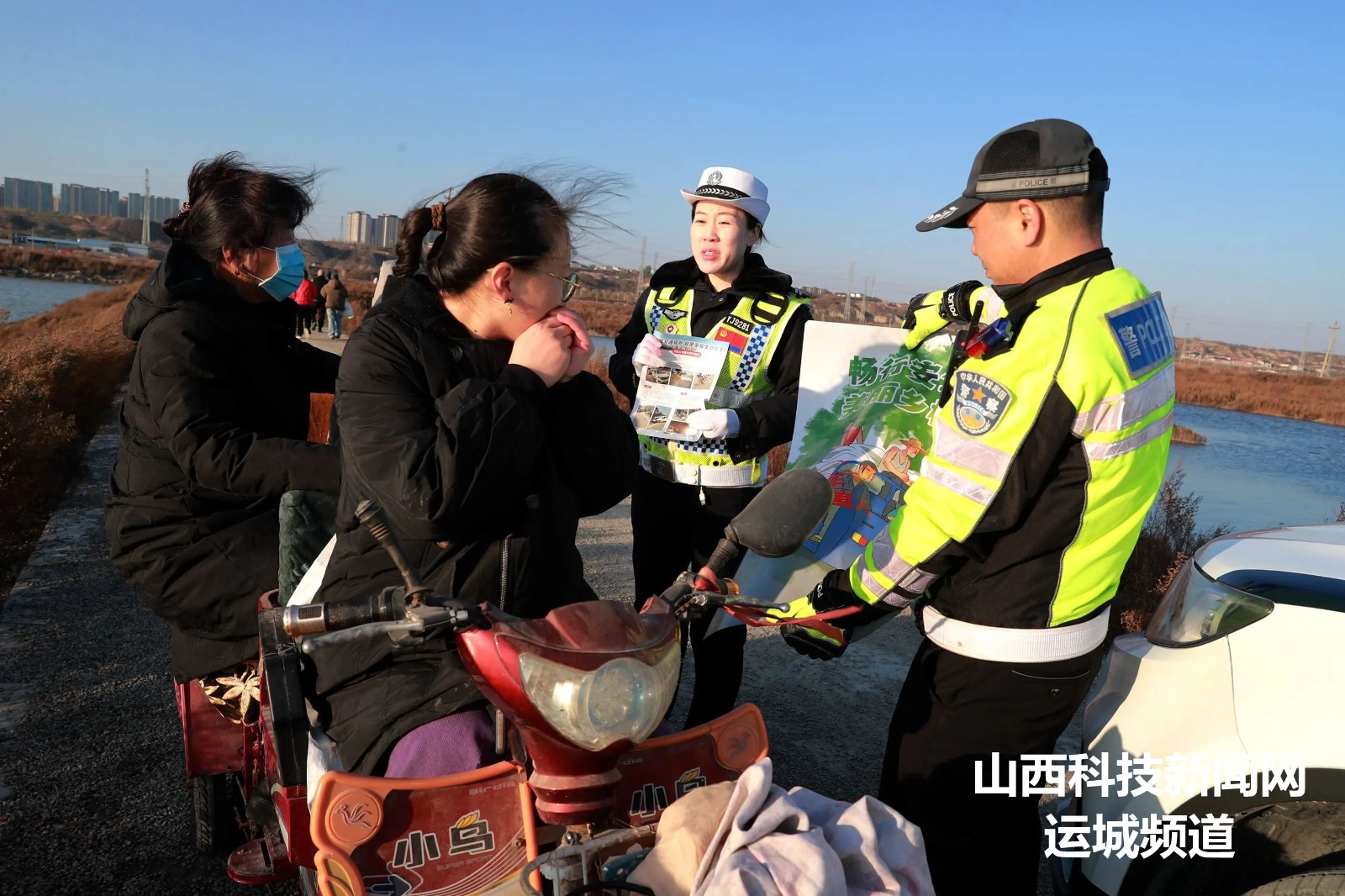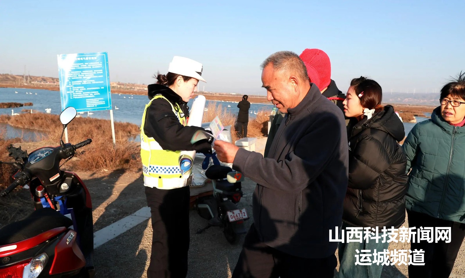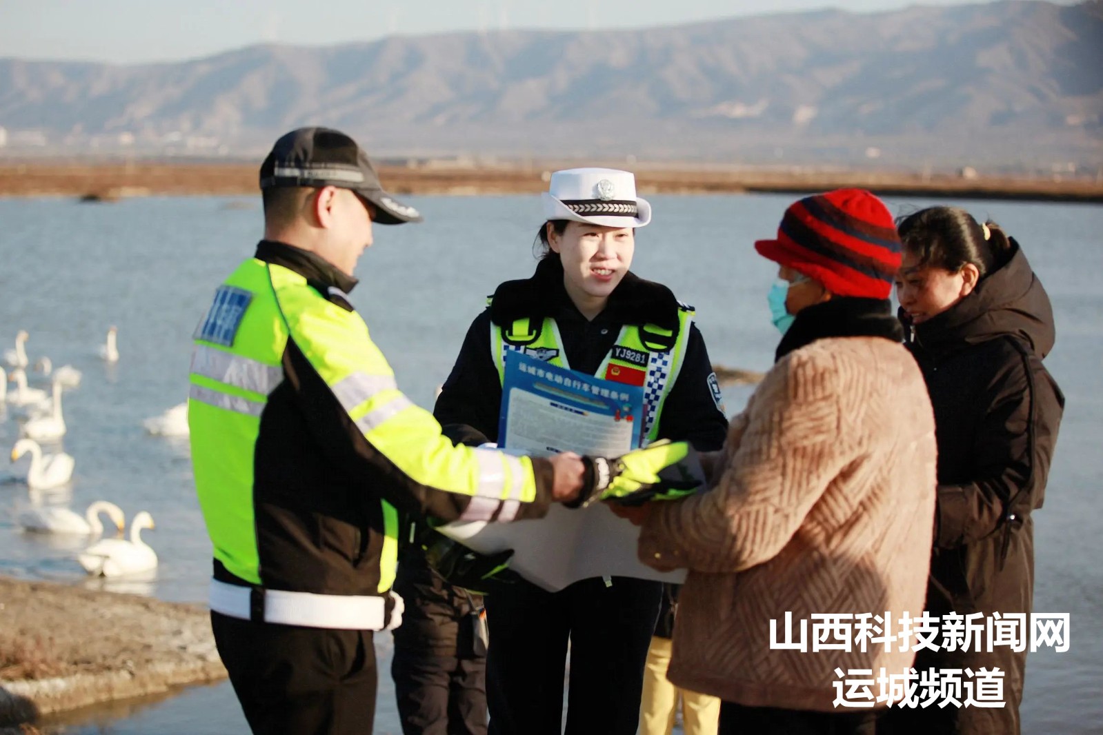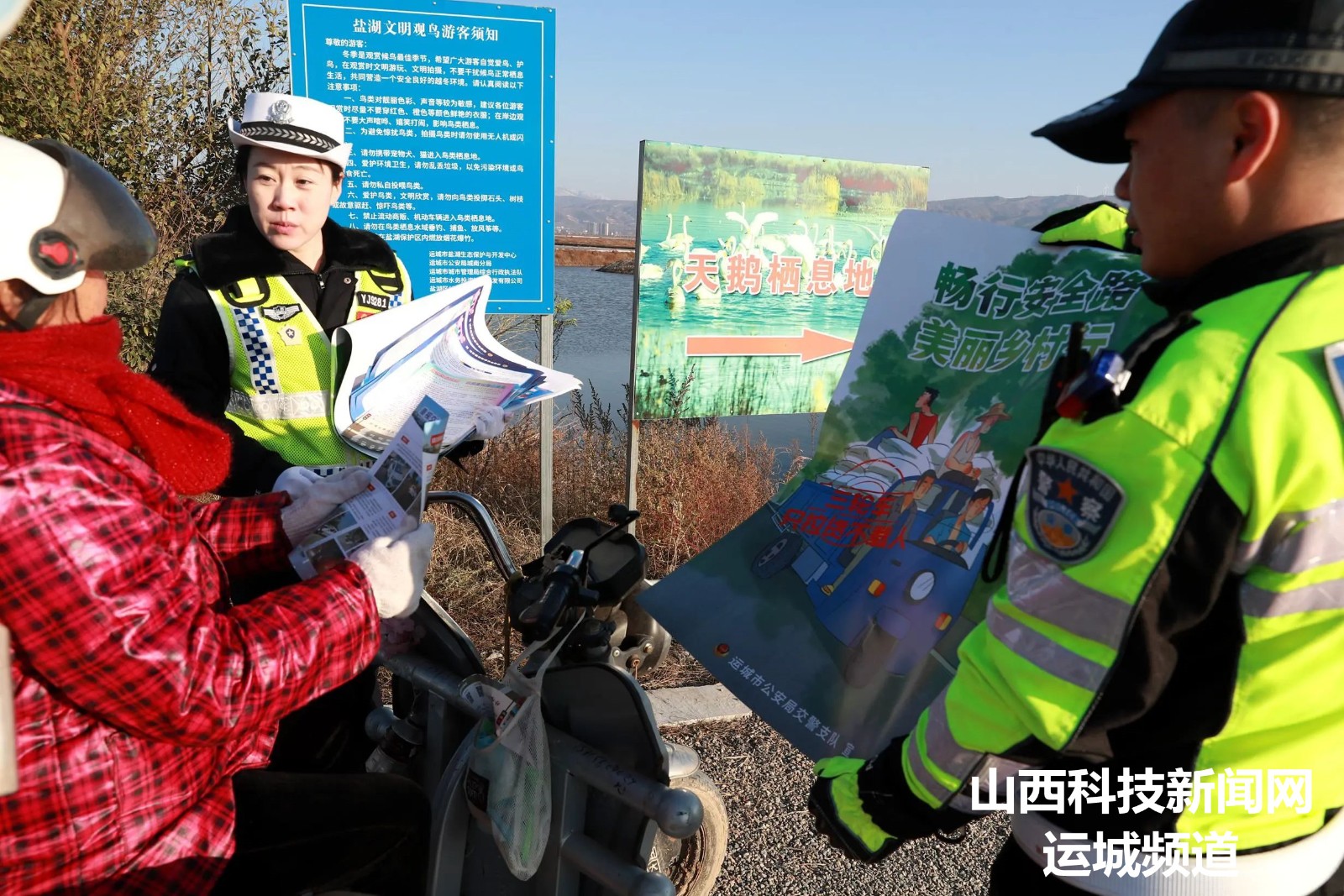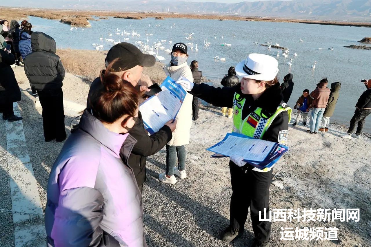 近日,山西运城盐湖进入“天鹅”时间,针对部分群众观赏天鹅途中存在三轮车违法载人、不戴安全头盔等交通违法行为,11月26日,运城市公安局盐湖分局交警大队摩巡中队和宣传民警走进滨湖大道鸭子池天鹅观赏路段,加强巡逻管控,通过散发宣传彩页、张贴安全海报、面对面开展劝导和宣传教育,提醒游客不乘坐“老头乐”,严禁三轮车载人、骑乘电动车要佩戴安全头盔,做到文明出行,平安回家。