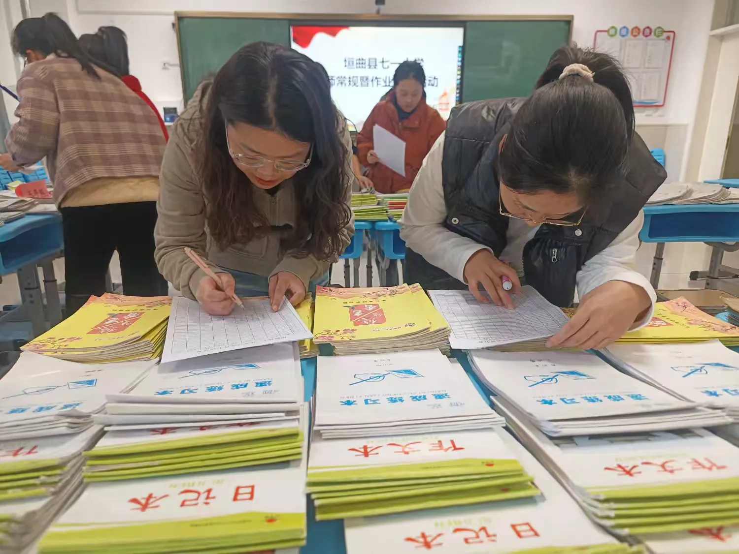 在展评现场,教师常规资料整齐有序,各教研组分工明确,有条不紊地开展工作。在备课、作业等重要资料的检查过程中,各学科教研组长秉持着严谨认真的态度,对每一位教师的备课、辅导以及作业批改等情况都进行了细致入微的查阅,并且一一做了详细而准确的记录。