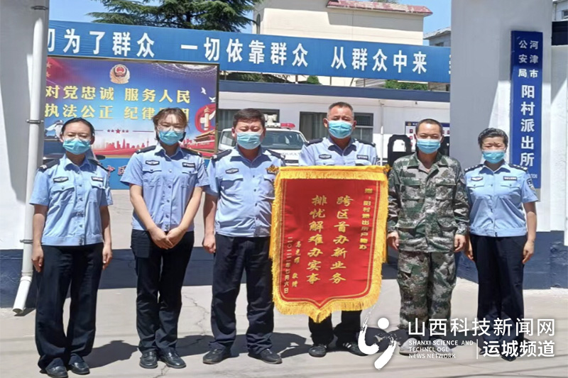 山西科技新闻网运城讯(牛慧霞)为进一步深化户籍管理“放管服”改革、扎实开展“我为群众办实事”实践活动,确保“全省通办”便民服务工作措施落地见效,打通服务群众的最后一公里。河津市公安局阳村派出所始终坚持人民至上的服务理念,秉承“公正、热情、便捷、高效”的服务宗旨,聚焦群众“急、难、愁、盼”问题,用心用情为群众办实事、办好事,暖心的服务赢得了群众的赞誉。2022年7月6日河津电厂职工马先生给户籍室送来了一面写着“跨区首办新业务、排忧解难办实事”的锦旗,来表达他父母对阳村派出所的谢意。