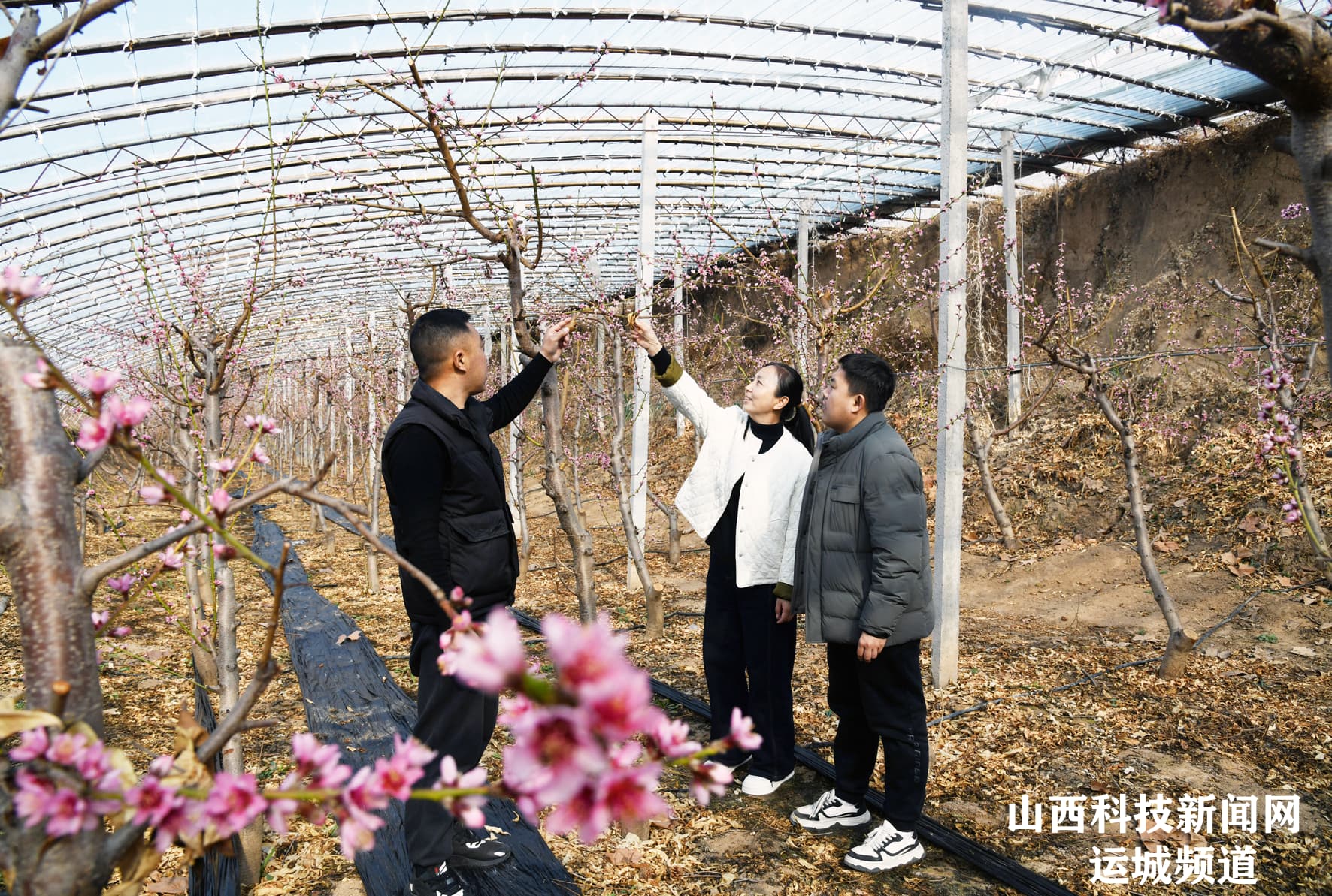 山西科技新闻网运城讯 2月27日,闻喜县阳隅镇小张村集体兴建的油桃暖棚里,托管承包人杨锐和员工正在为桃树进行人工授粉,4月中旬这里生产的世纪星良种油桃将以七,八元的高价抢鲜上市,比大田油桃提前两个月时间。