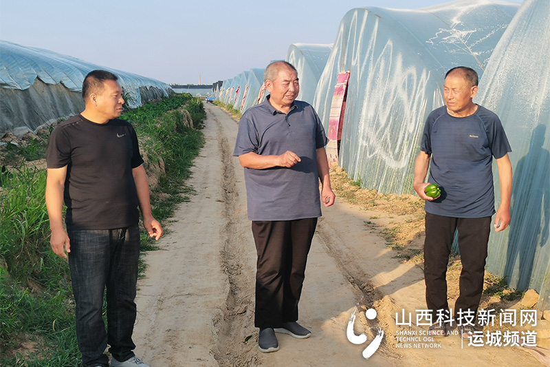 下高池村党支部书记王长吉(中)与支、村委在合作社弓棚查看圆椒长势 张广瑞/摄