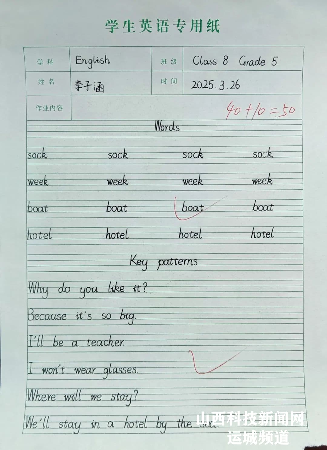 五年级的孩子们书写单词规范,句子流畅,每个细节都透露出孩子们英语书写扎实的基本功。