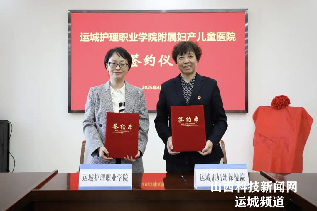 运城护理职业学院院长宋丽华与运城市妇幼保健院院长郑秀萍签订合作协议。