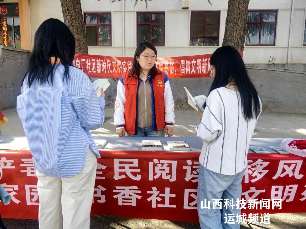 2025年4月23日是第三十个世界读书日,为了激发全民阅读热情,培养居民好读书、读好书、善读书的良好阅读习惯,永济市热电厂社区设置“全民阅读,书香社区”摊位,向居民讲解世界读书日的由来和阅读的好处,并推荐一些书目和网上阅读APP。居民拿起桌上关于永济传统文化的书,津津有味地看着,并与社区工作人员交流书上内容,发表个人看法,谈论收获。