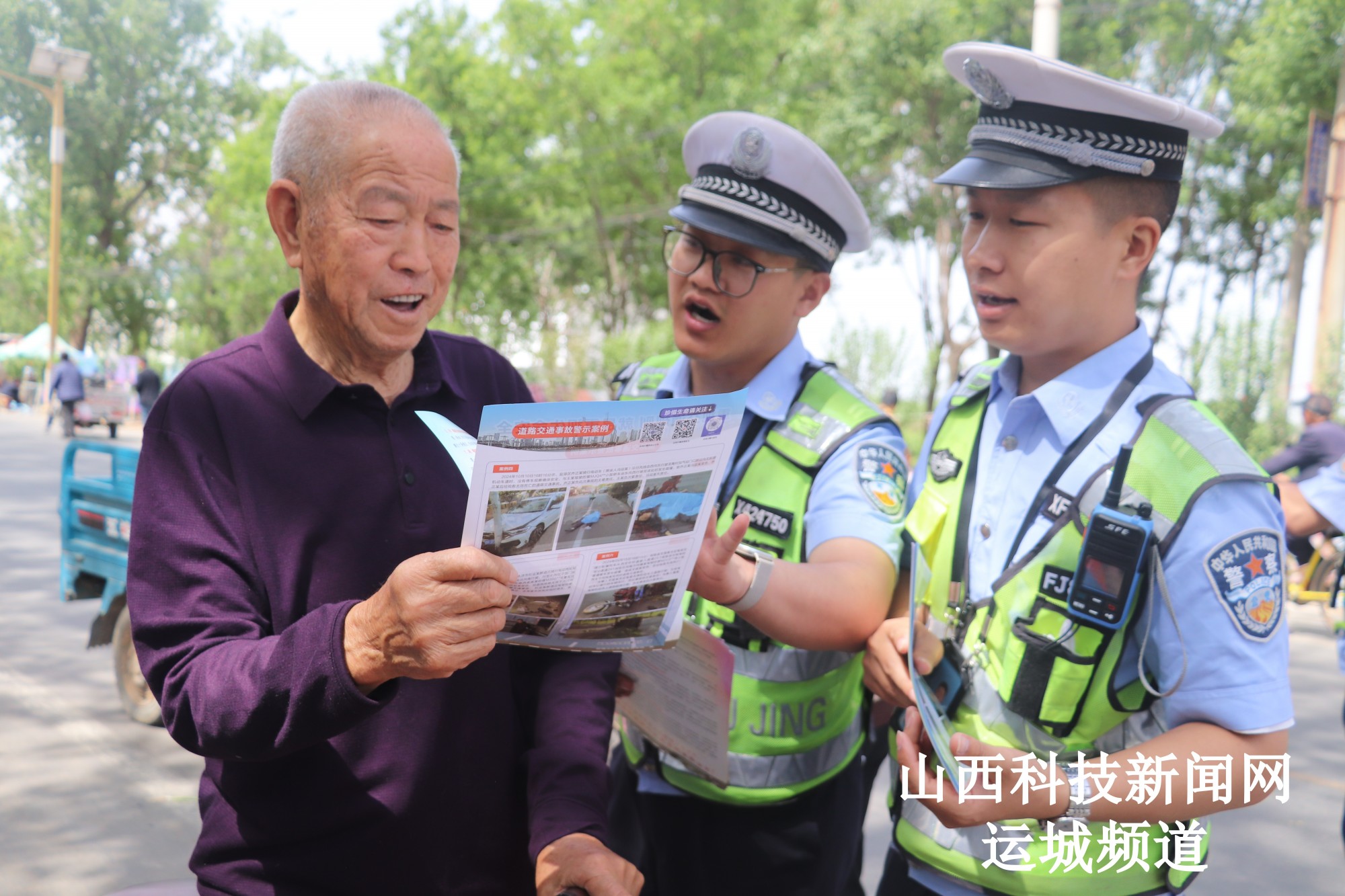 民警运用通俗易懂语言,通过展示事故案例展板、发放宣传资料、普及交通安全知识等形式,向过往群众和驾驶人讲解三轮车违法载人、闯红灯、酒醉驾、涉牌涉证、疲劳驾驶、骑乘电动车摩托车不佩戴安全头盔、乱停乱放等交通违法行为的危害性,引导大家自觉遵守交通法规,摒弃交通陋习,杜绝麻痹思想和侥幸心理,养成文明出行的良好习惯。