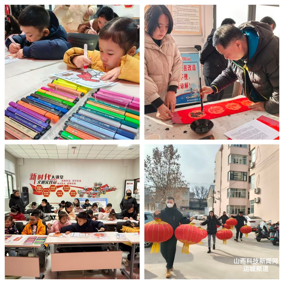 教育小区党群服务站里,应邀而来的社区居民正挥毫泼墨,笔走龙蛇。一幅幅饱含美好祝福的春联、一个个喜庆吉祥的“福”字跃然纸上。儿童绘画涂色区,孩子们围坐一起,手持画笔认真为春节主题涂色卡填色,喜庆的图案在孩子们的笔下变得五彩斑斓。随后,社区工作人员与居民将灯笼悬挂在辖区内指定区域,整个社区节日氛围浓厚,年味扑面而来。