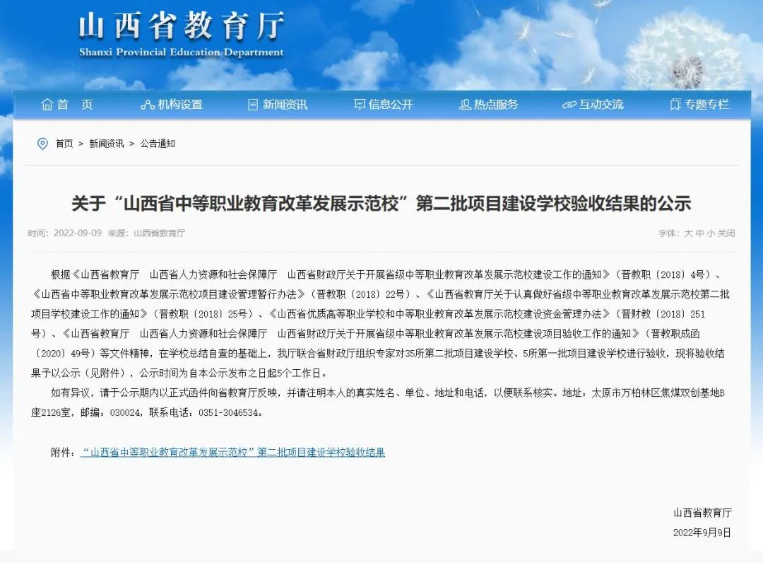 山西科技新闻网运城讯 2022年9月9日,山西省教育厅发布关于“山西省中等职业教育改革发展示范校”第二批项目建设学校验收结果的公示,新绛县职业教育中心正式通过验收!