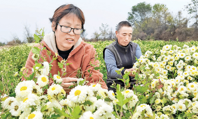 近日,芮城县西陌镇东陌村七组居民苏狗宣、杨界菊夫妇正在忙着采摘茶菊。常态化疫情防控之后,当地村民抓紧晴好天气抢收抢种,田野上一片忙碌景象。(董应赞)
