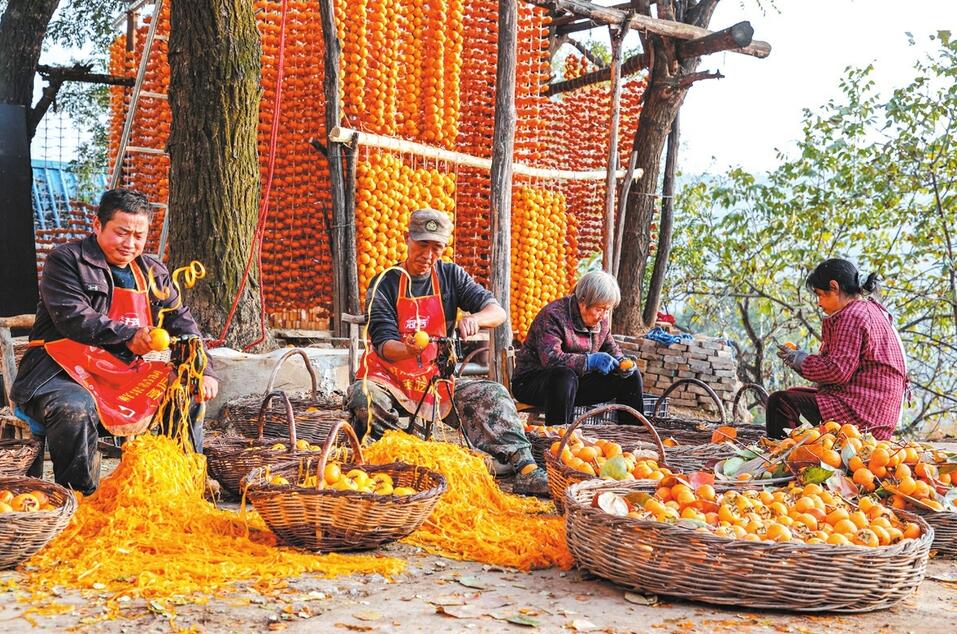 金秋时节,平陆县三门镇马泉沟村柿子喜获丰收。村民忙着采收、削皮、晾晒,制作柿饼,一串串火红的柿子成为小山村里一道亮丽的风景线。由于当地独特的水土气候,这里所产的柿子无核或少核,加工成的柿饼能溶于水,被当地人称为“水化柿”,是我国独特的柿种珍品。加工好的“水化”柿饼每斤可卖到30多元,平均每户可以收入近3万元。图为村民正在给柿子削皮。刘文礼摄影报道