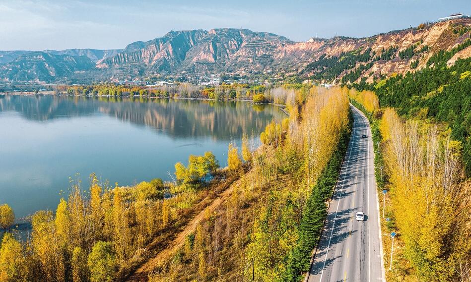 初冬时节,平陆县黄河湿地金色的树叶与清澈的水面、绵延的黄河一号旅游公路交相辉映,宛如一幅美丽画卷。薛俊摄