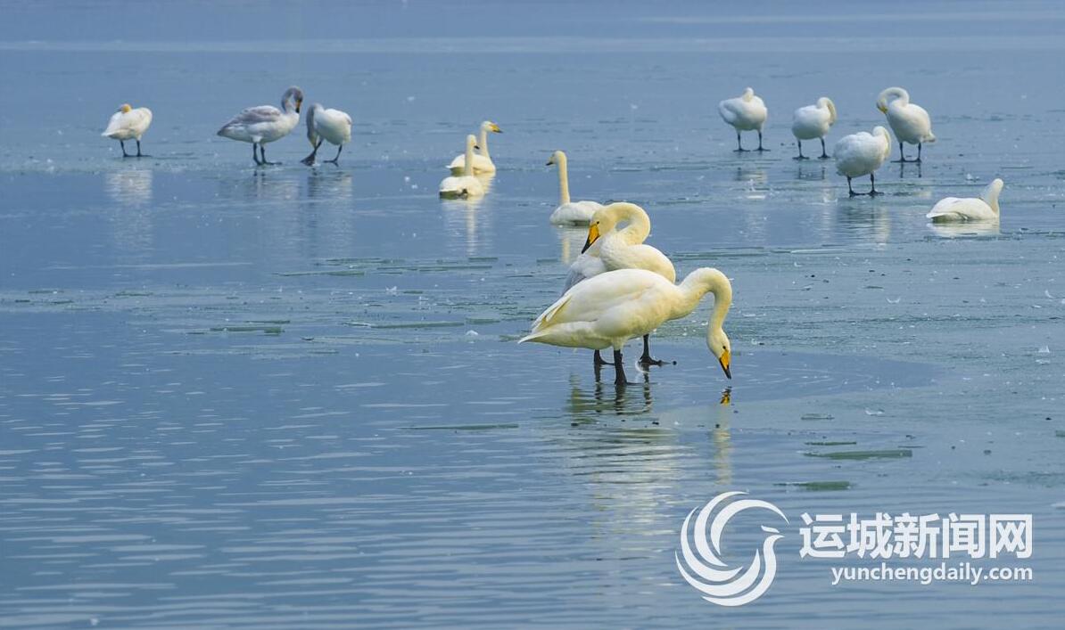 11月16日,成群的白天鹅在芮城县圣天湖嬉戏觅食。