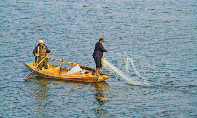 11月20日,渔业养殖户在鸭子池内乘船撒网。 近年来,随着我市鸭子池水生态综合提升工程的实施,昔日的荒滩池变得水肥、草美、景色迷人。当地村民利用鸭子池的水资源,大力发展渔业养殖,把它变成了农民增产增收的“金银池”。(姜桦)