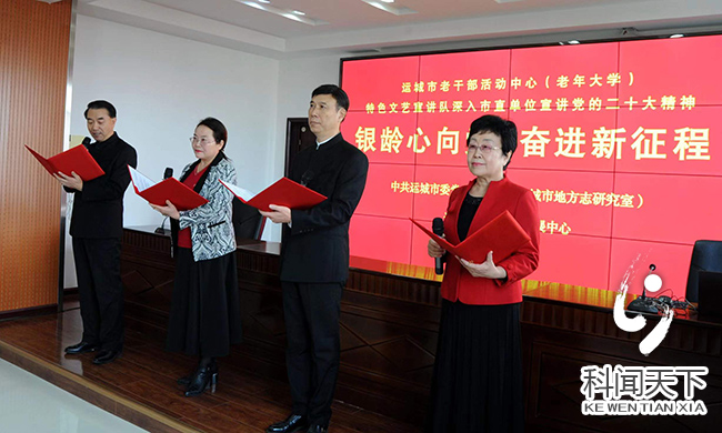 科技新闻网运城11月25日电 (记者尹智慧)11月25日下午,运城市老年大学老干部们用特色的方式为运城现代农业发展中心和市委党史研究室开展一场“银铃心向党 奋进新征程”为主题的二十大精神宣讲活动。整个现场高潮迭起,老干部们把党的二十大精神从“书面语”变为“诗朗诵”形式,以特殊的表演方式宣讲二十大精神,让党的二十大精神通过“实”的内容、“活”的方式、“俗”的语言“留”在群众心里。