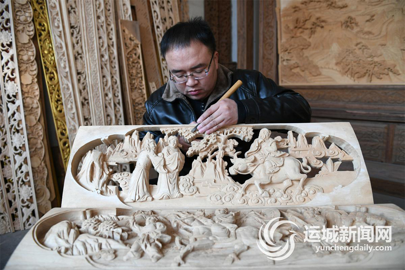 12月8日,省级非物质文化遗产稷山木雕的第六代传承人曹晓理在精心创作木雕作品。