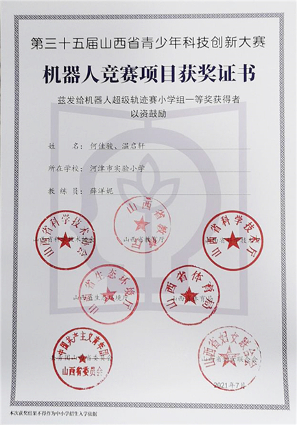 竞赛中,运城代表队共有13支参赛队获奖,其中,河津市实验小学何佳骏、温启轩荣获机器人超级轨迹赛小学组1等奖;盐湖区解州小学、魏风小学、运城市新港实验学校参赛项目——协助防疫机器人获机器人创意比赛小学组2等奖,河津市铝基地朝霞小学、河津市实验小学、运城市东郊逸夫小学、运城市东康中学等4支参赛队获机器人超级轨迹赛小学组2等奖;此外还有7支参赛队分别获机器人创意比赛、机器人创新挑战赛、机器人超级轨迹赛3等奖。