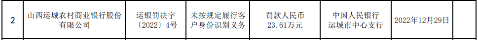 昨日,人民银行太原中心支行网站显示,山西运城农村商业银行因未按规定履行客户身份识别义务,被人民银行运城市中心支行处罚款23.61万元。