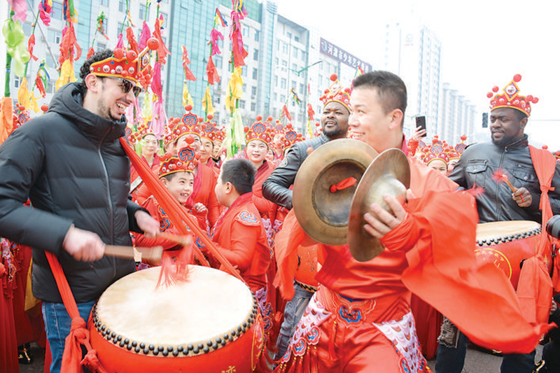 非物质文化遗产高家湾端阳锣鼓表演结束后,在闹社火群众的盛情邀请下,外籍友人到行进队伍中作现场体验。
