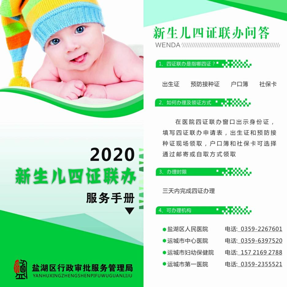 2020年5月21日新生儿“四证联办”集成服务改革正式启动,标志着盐湖区行政审批服务管理局在全省率先以自然人生命周期为起点进行服务事项的梳理;实现多部门联动并联审批的服务模式;以“就近办”为目标,开创窗口前移模式;实现政府部门自主开发系统获得国家版权局下发的版权证书;以把简便带给群众,把服务留给政府,把复杂交给系统服务的思路落实到工作中去。今年率先实现两个全覆盖工作目标“盐湖区境内助产机构全覆盖,盐湖籍婚生新生儿全覆盖”;率先实现和民营助产机构合作。共计助产机构11家,受惠家庭1258户。(杨天鹏)