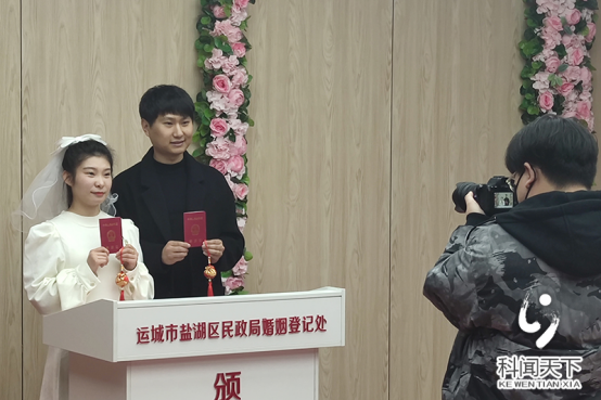 在运城盐湖区政务大厅民政局门口,从远处就看到一对年轻的情侣,在亲朋好友的祝福声中,满脸洋溢着幸福。