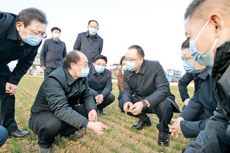 时近雨水,芮城县东垆乡的冬小麦开始返青。金湘军走进田间察看苗情,与育种专家交流。他说,种子是农业的“芯片”,要加强科研攻关,加快育种产业化步伐,带动农业增效农民增收。各级各部门要不误农时抓好春耕备耕,为粮食增产打下坚实基础。做好“土特产”文章,因地制宜,找准特色,延长产业链价值链,以产业振兴支撑乡村全面振兴。