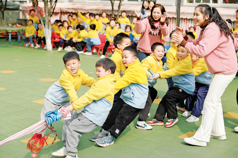 2月20日,江西省吉安市吉州区保育院的孩子们在“二月二,龙抬头”活动中参加拔河比赛。 新华社发(李 军 )