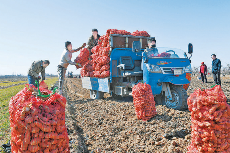 2月20日,稷山县太阳乡西里村村民在田间转运采挖的中药材地黄。