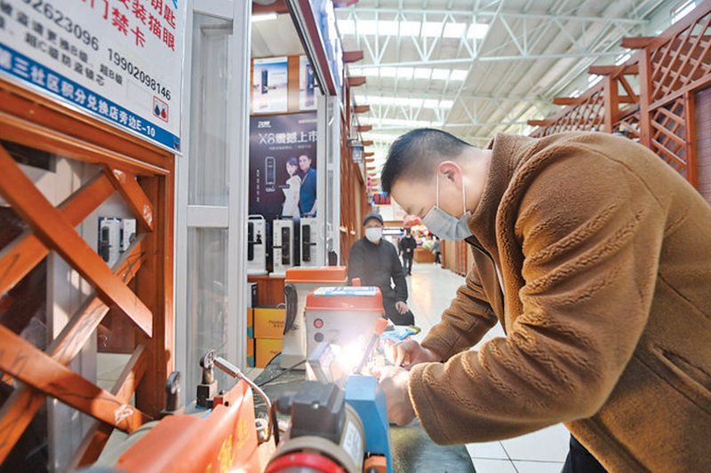 在中新天津生态城第三社区中心,一家开锁行经营者正在为顾客配钥匙。 近年来,位于天津市滨海新区的中新天津生态城通过打造社区中心积极推进城市“一刻钟便民生活圈”建设,服务基本民生,畅通城市经济微循环。目前,中新天津生态城已运营社区中心3处,中心内均设有菜市场、餐饮、连锁超市、“小修小补”等商户,并集纳医疗服务、活动健身等便民服务设施,以满足周边居民的日常生活和文化娱乐需求。(赵子硕)
