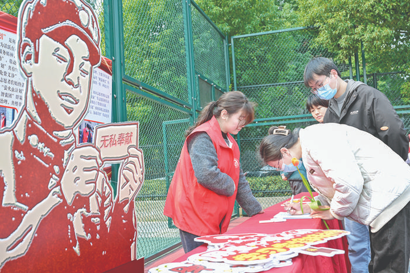 3月1日,在安徽合肥市南七街道科企社区,工作人员(左)现场招募社区志愿者。这些志愿者将开展种类多样的志愿服务活动,以实际行动传承雷锋精神。(周牧)