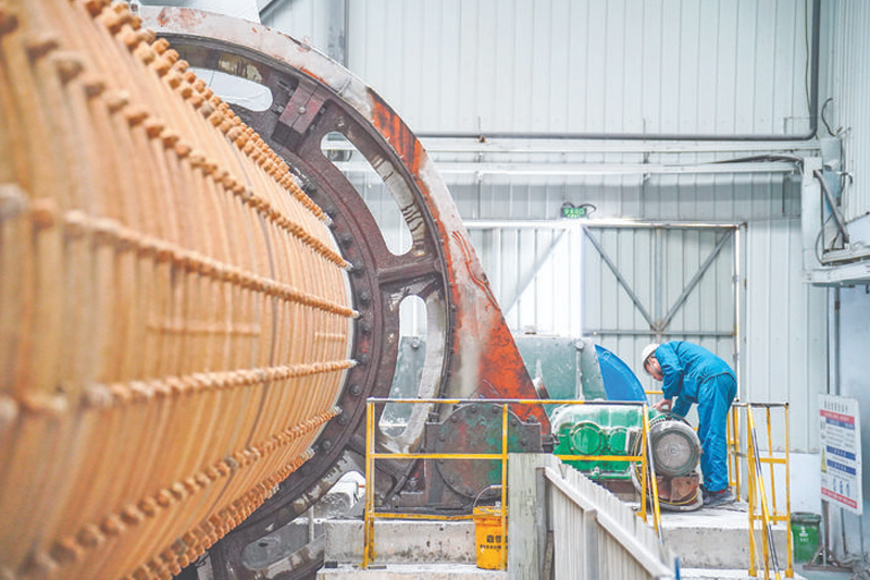 近日,山西予知新材料有限公司工人在车间内对球磨机减速机联轴器端面进行校准。