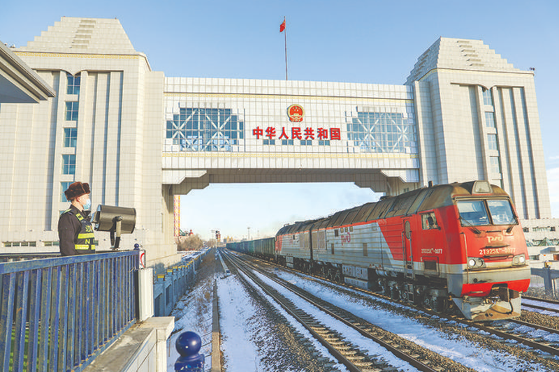 近日在满洲里铁路口岸拍摄的出境货运列车。 满洲里口岸是中国最大的陆路口岸,也是中欧班列东通道进出境重要口岸。自1月8日满洲里公路口岸恢复客运通关以来,客流量呈稳步增长态势。铁路方面,年初至3月14日,经满洲里铁路口岸通行的中欧班列达924列97828标箱,较去年同期分别增长8.2%、19.8%,通关工作有序进行。(李发春)