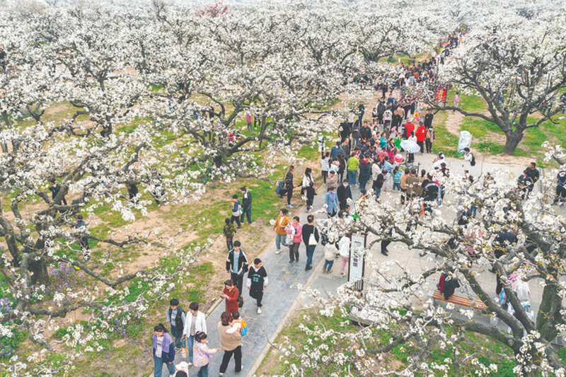 3月26日,游客在砀山县的梨园里赏花。近日,安徽省宿州市砀山县50万亩梨树进入盛花期,丰富多彩的活动在梨园举行,吸引游客前来赏花踏春。(崔猛)