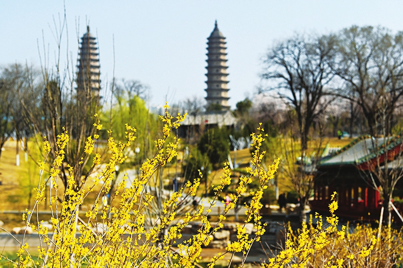 3月26日,太原双塔公园繁花似锦,衬托着凌霄双塔尽显无限春色。连日来,随着天气逐渐转暖,古韵悠悠的双塔公园成为市民踏青赏春的热门打卡地。(李兆民)