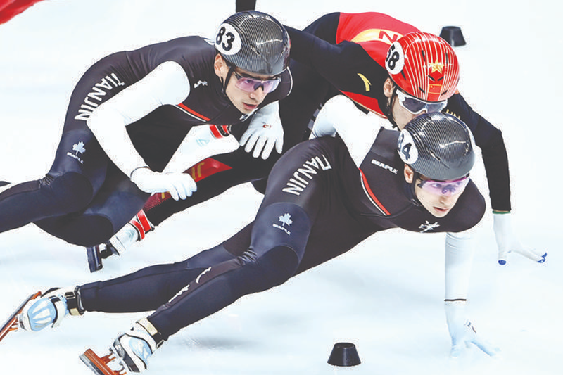 4月2日,天津市冬季和水上运动管理中心选手刘少昂(右)和刘少林(左)在男子1000米比赛中。刘少昂以1分26秒082的成绩获得冠军,刘少林以1分26秒189的成绩获得亚军。 当日,2022~2023赛季全国短道速滑冠军赛在北京首都体育馆落幕。(贺长山)
