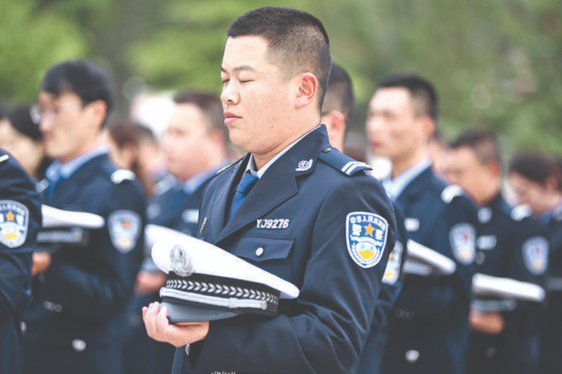 全体民辅警在烈士纪念碑下,面对鲜艳的警旗,庄严地举起右拳,铿锵有力地重温入警誓词。