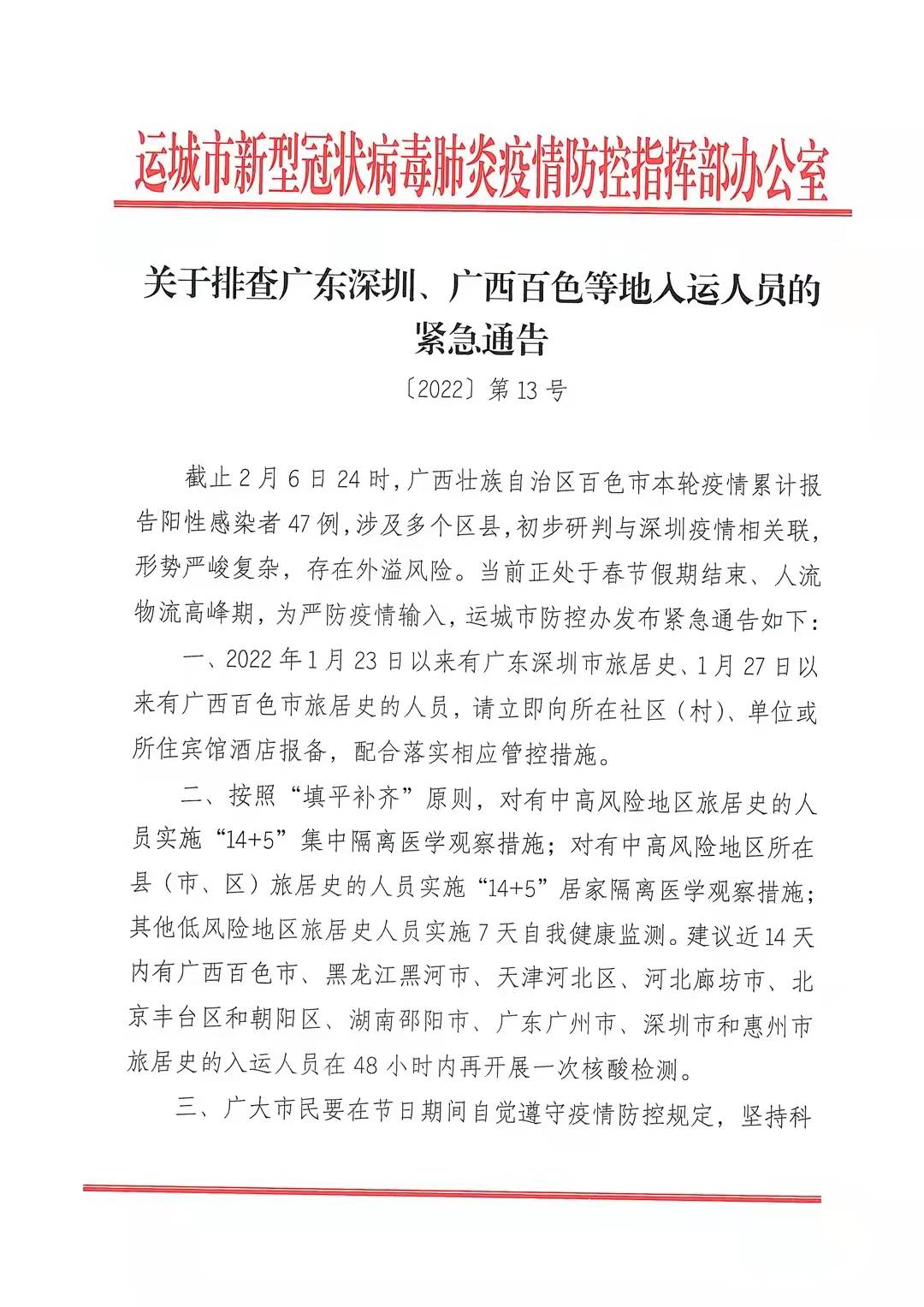 截止2月6日24时,广西壮族自治区百色市本轮疫情累计报告阳性感染者47例,涉及多个区县,初步研判与深圳疫情相关联,形势严峻复杂,存在外溢风险。当前正处于春节假期结束、人流物流高峰期,为严防疫情输入,运城市防控办发布紧急通告如下: