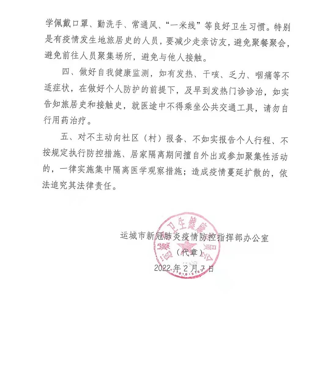 一、2022年1月23日以来有广东深圳市旅居史、1月27日以来有广西百色市旅居史的人员,请立即向所在社区(村)、单位或所住宾馆酒店报备,配合落实相应管控措施。 二、按照“填平补齐”原则,对有中高风险地区旅居史的人员实施“14+5”集中隔离医学观察措施;对有中高风险地区所在县(市、区)旅居史的人员实施“14+5”居家隔离医学观察措施;其他低风险地区旅居史人员实施7天自我健康监测。建议近14天内有广西百色市、黑龙江黑河市、天津河北区、河北廊坊市、北京丰台区和朝阳区、湖南邵阳市、广东广州市、深圳市和惠州市旅居史的入运人员在48小时内再开展一次核酸检测。 三、广大市民要在节日期间自觉遵守疫情防控规定,坚持科学佩戴口罩、勤洗手、常通风、“一米线”等良好卫生习惯。特别是有疫情发生地旅居史的人员,要减少走亲访友,避免聚餐聚会,避免前往人员聚集场所,避免与他人接触。 四、做好自我健康监测,如有发热、干咳、乏力、咽痛等不适症状,在做好个人防护的前提下,及早到发热门诊诊治,如实告知旅居史和接触史,就医途中不得乘坐公共交通工具,请勿自行用药治疗。 五、对不主动向社区(村)报备、不如实报告个人行程、不按规定执行防控措施、居家隔离期间擅自外出或参加聚集性活动的,一律实施集中隔离医学观察措施;造成疫情蔓延扩散的,依法追究其法律责任。