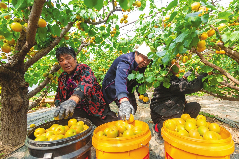 4月6日,夏县胡张乡西下冯村果农正在采摘成熟的“金太阳”大黄杏。夏县胡张乡各村农户在乡村“两委”班子的号召下,从1999年开始便发展杏树种植产业,通过多年的发展,到目前全乡大棚和大田杏树的种植面积达2000余亩,种植生产的大黄杏销往全国各地,已成为当地农民的支柱产业。