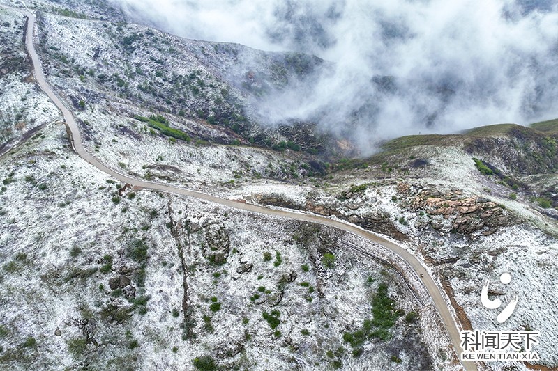 连日来,山西省运城市夏县出现强降雨天气,气温逐然下降,受冷空气影响,绵延起伏的中条山上春雪飘飘洒洒落下。