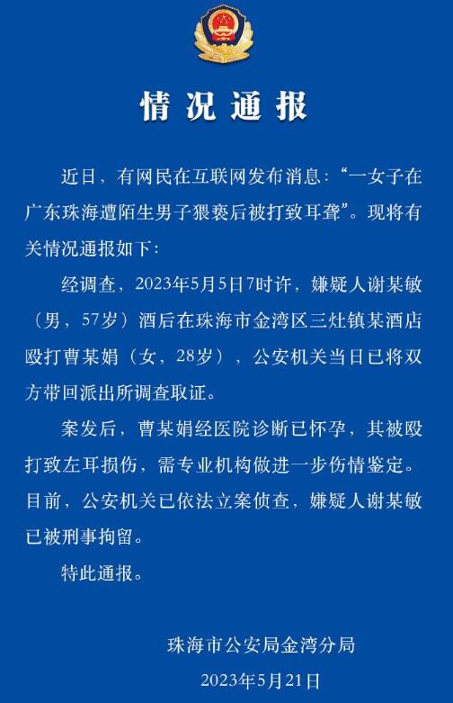 案发后,曹某娟经医院诊断已怀孕,其被殴打致左耳损伤,需专业机构做进一步伤情鉴定。目前,公安机关已依法立案侦查,嫌疑人谢某敏已被刑事拘留。