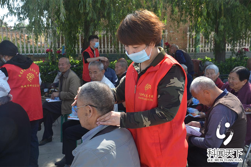 在陶村镇日间照料中心广场志愿者为老人进行公益按摩