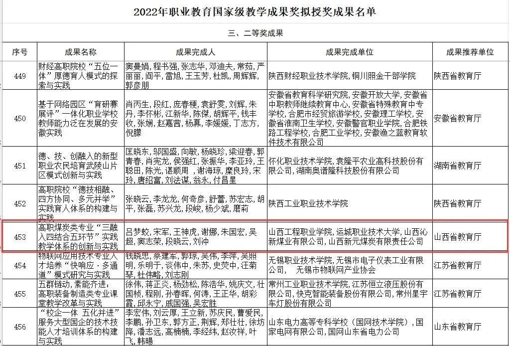 科技新闻网运城电(黄彩霞)5月15日,教育部公示了2022年职业教育国家级教学成果奖拟授奖成果,目前公示期已结束。本网获悉运城职业技术大学作为成果第二完成单位参与的《高职煤炭类专业“三融入四结合五环节”实践教学体系的创新与实践》获国家级教学成果二等奖,这是该校第二次获得该奖项。