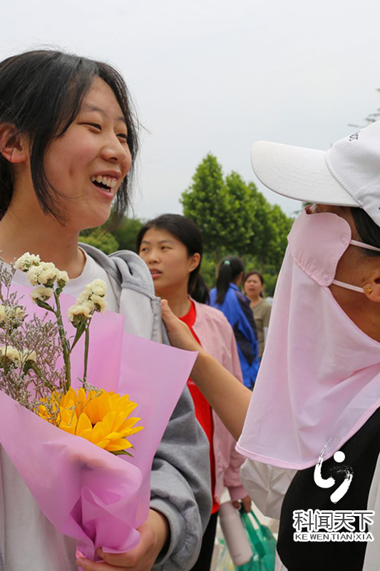 6月7日,在夏县二中考点,一位结束首场科目考试的考生笑容满面,在安全线上接受父母亲送来的鲜花。