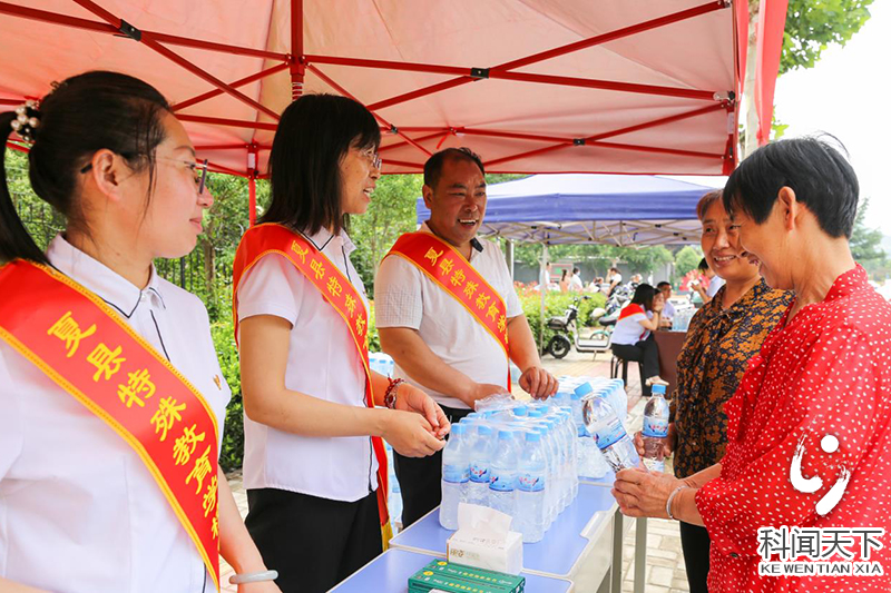 6月7日,在夏县二中考点,夏县特殊学校志愿者给考生家长免费发放矿泉水。